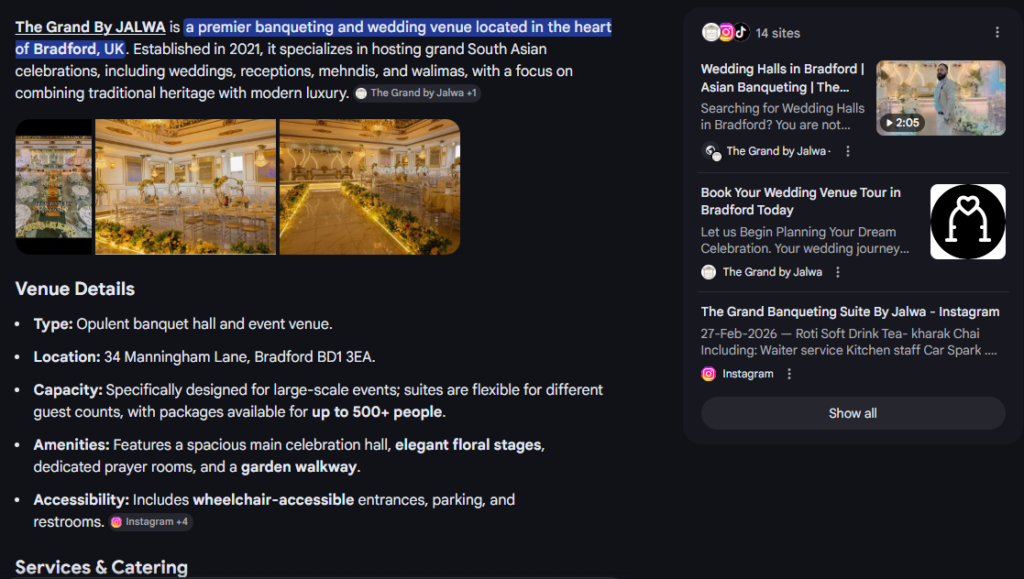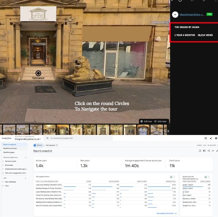 The Grand By Jalwa’s tour views grew steadily over 16 months. Some venues see engagement immediately. The key is getting the tour live and letting couples explore.We will look at your online presence for free. No cost. No sales pitch. Just honest feedback.