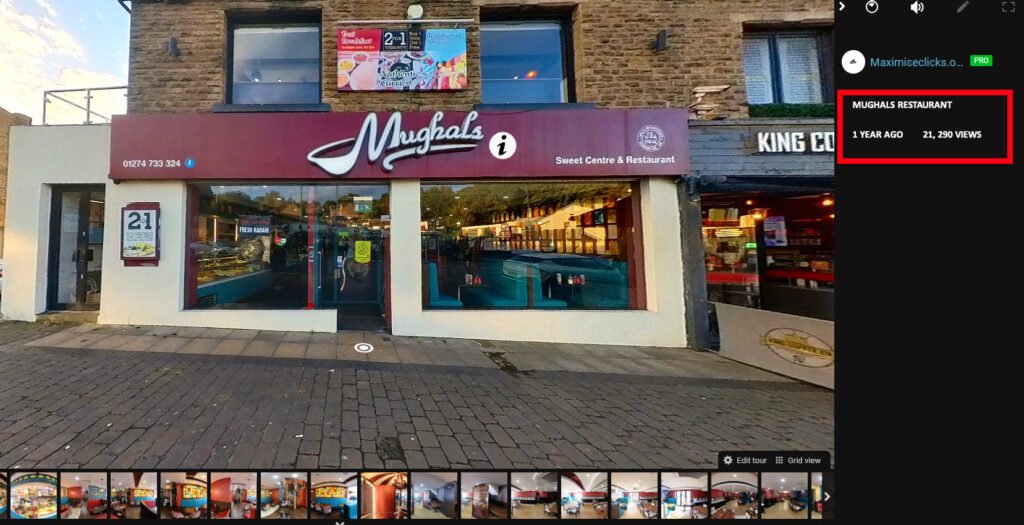 The Mughals 360 degree virtual tour has been viewed 21,290 times. Customers can walk through the restaurant, explore the dining area, and see the space before they visit or before they place an order. This kind of visual certainty builds trust in a way that a menu photo never can.